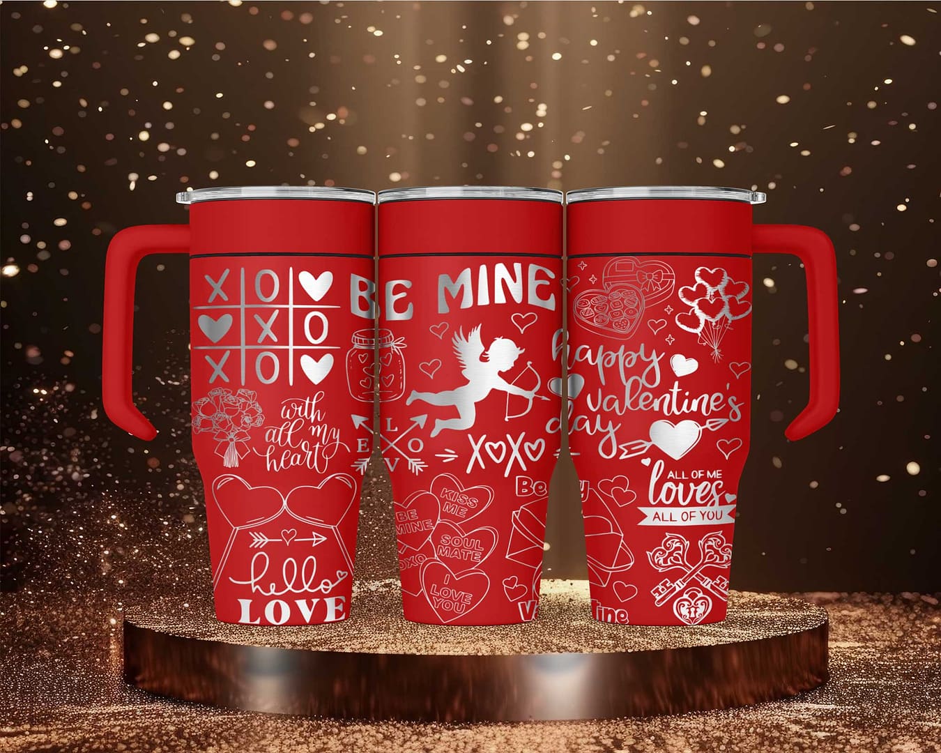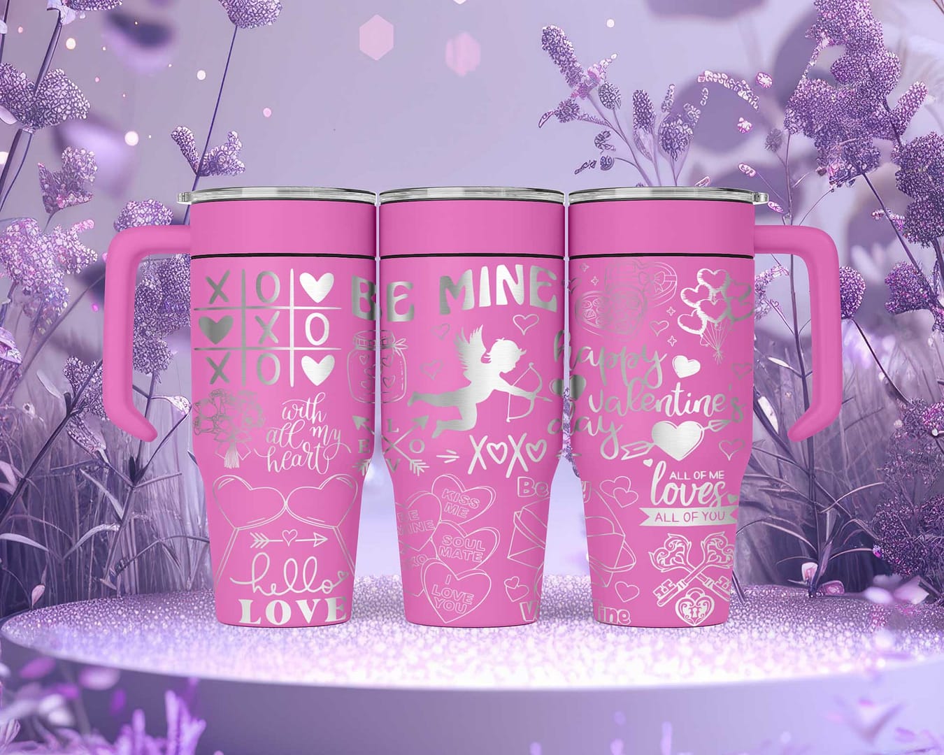 Celebrate the season of love with our 30oz custom laser engraved Valentines Tumbler, the ultimate expression of affection and charm. Featuring an intricate motif of Cupid and his arrow surrounded by heartfelt phrases such as “Be Mine,” “Happy Valentines Day,” “All Of Me Loves All Of You!” and more, this tumbler embodies love in every detail. The design is complemented by an array of hearts, candies, and heart-shaped balloons, creating a truly romantic look perfect for Valentine’s Day.
