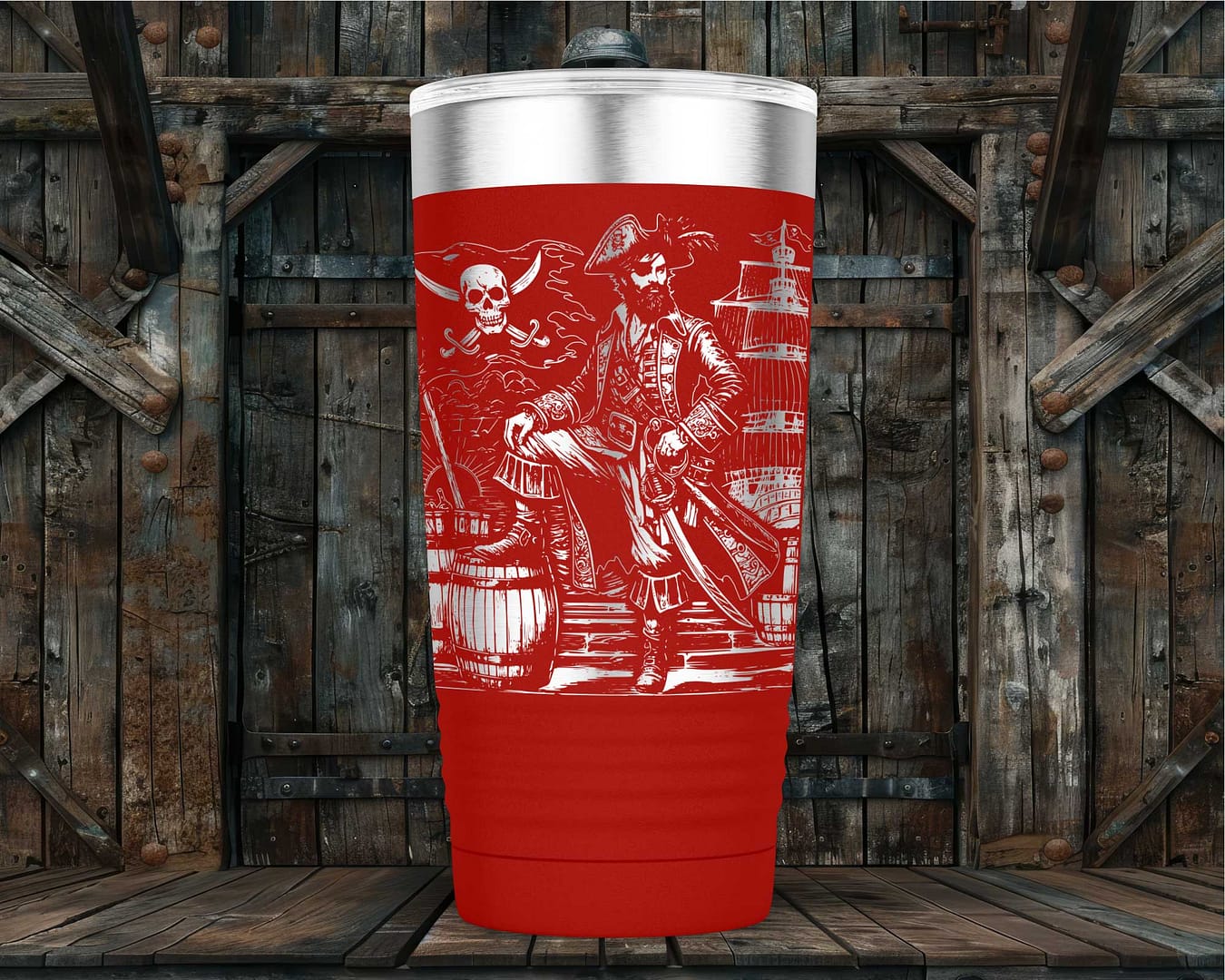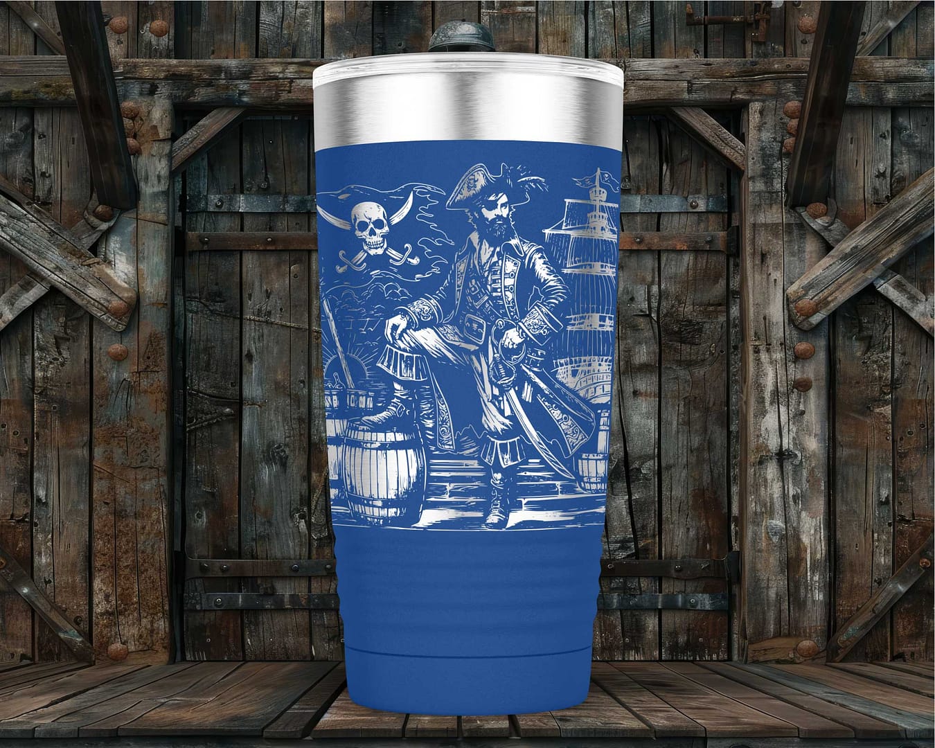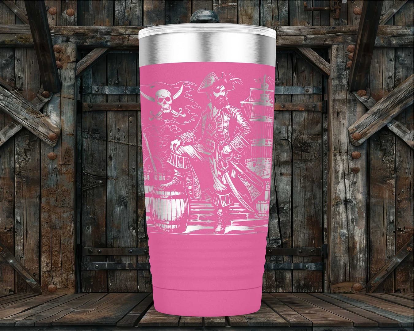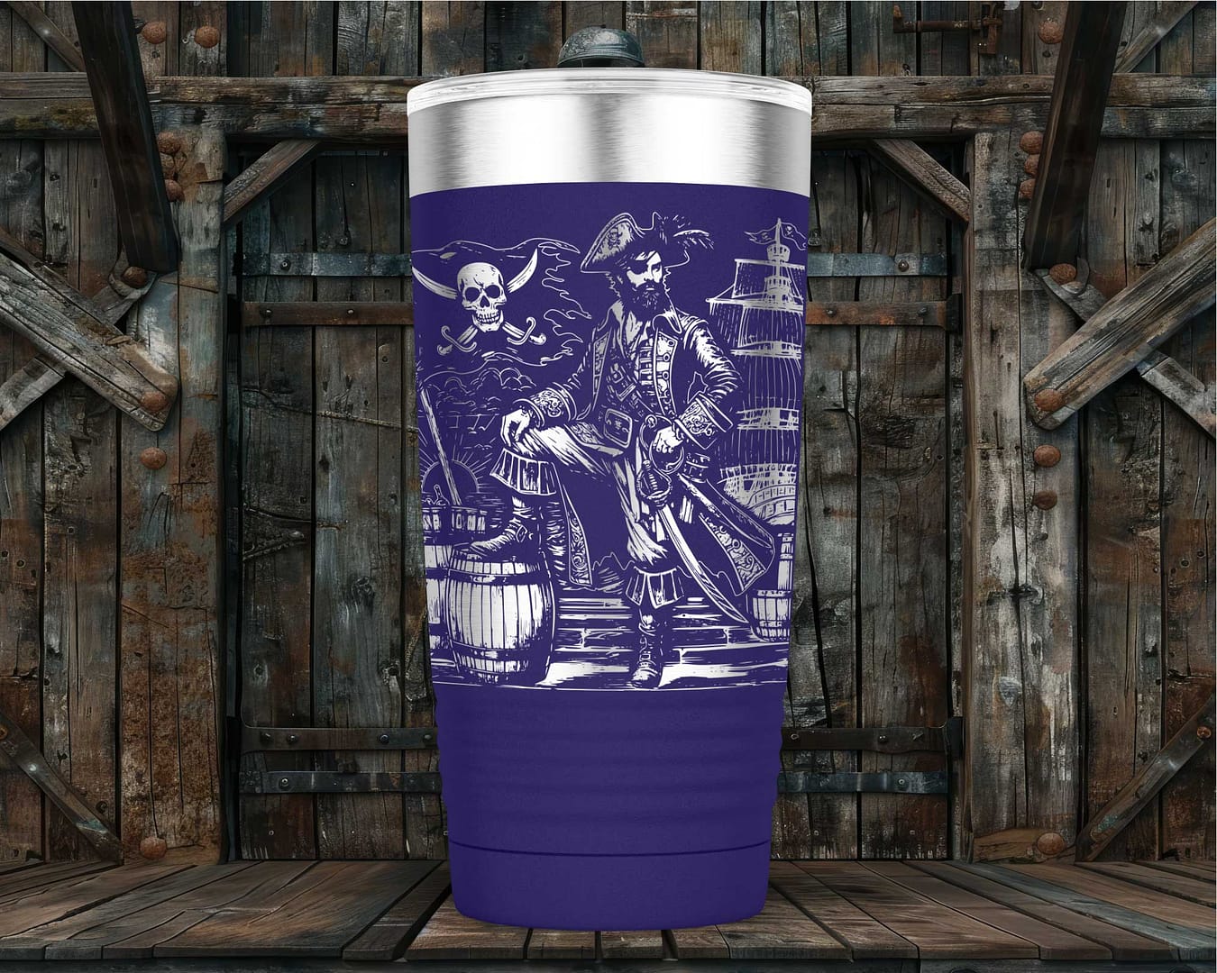 Stand out from the crowd with the captivating design of a crusty old pirate adorned with intricate pirate-themed decorations. Each detail is meticulously laser engraved, ensuring precision and a long-lasting finish. Available in vibrant colors such as Purple, Blue, Pink, and Red, as well as a timeless classic Black, this tumbler not only keeps your drink secure but also reflects your unique personality.